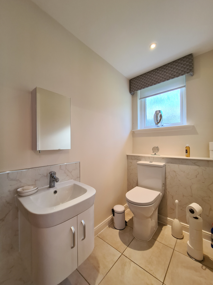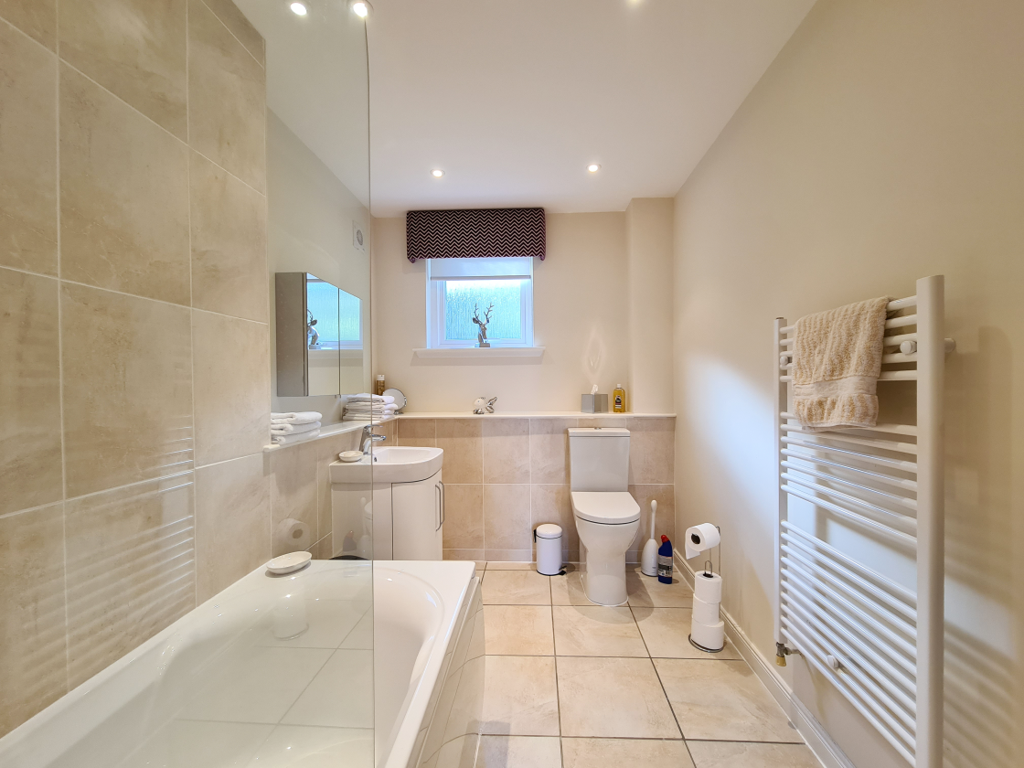 Spacious, modern partially tiled bathroom. Bath with shower over. Glass shower screen. Wall-hung hand basin vanity unit. WC. Ladder style towel radiator. Roller blind and pelmet. Spotlights.