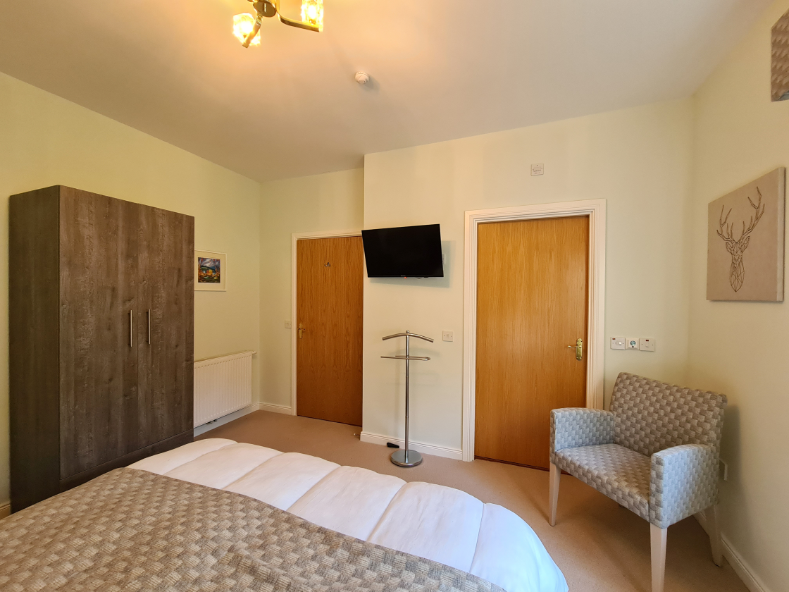 A spacious twin bedroom located to the rear of the property, enjoying attractive views over the garden and woodland beyond. The room is well presented with a ceiling light, fitted carpet, and roller blind with pelmet.