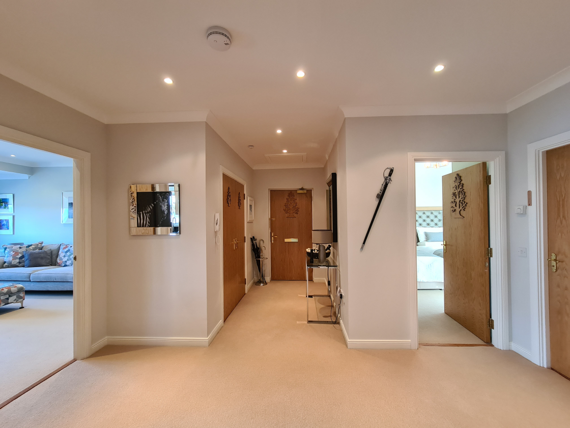 Bright and spacious hall with storage cupboard housing the electricity meter and switchboard (2.35m x 0.60m}. Loft hatch. Matching doors to all rooms. Spotlights. Carpet. Secure entry handset.