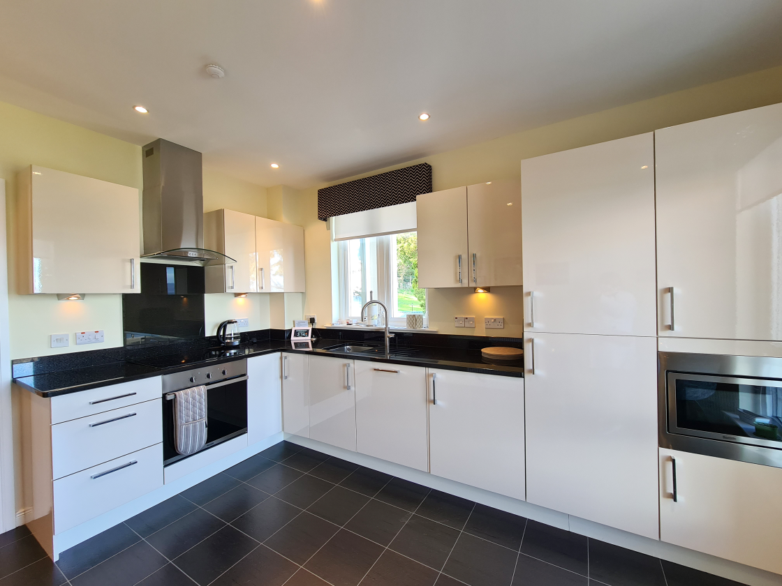 A bright and modern dining kitchen enjoying sea views from windows to both the front and side, creating a light and airy space. Fitted with a range of cream high-gloss wall and base units, complemented by stone granite worktops and under-cabinet lighting. The kitchen features an integrated stainless steel sink with drainer and Quooker hot water system, along with a full suite of integrated appliances including microwave, dishwasher, fridge/freezer, electric hob, oven, and cooker hood. Finished with spotlights, a tiled floor, and a Vokera combi boiler neatly housed within a cupboard. Bespoke blinds with pelmet complete the space.