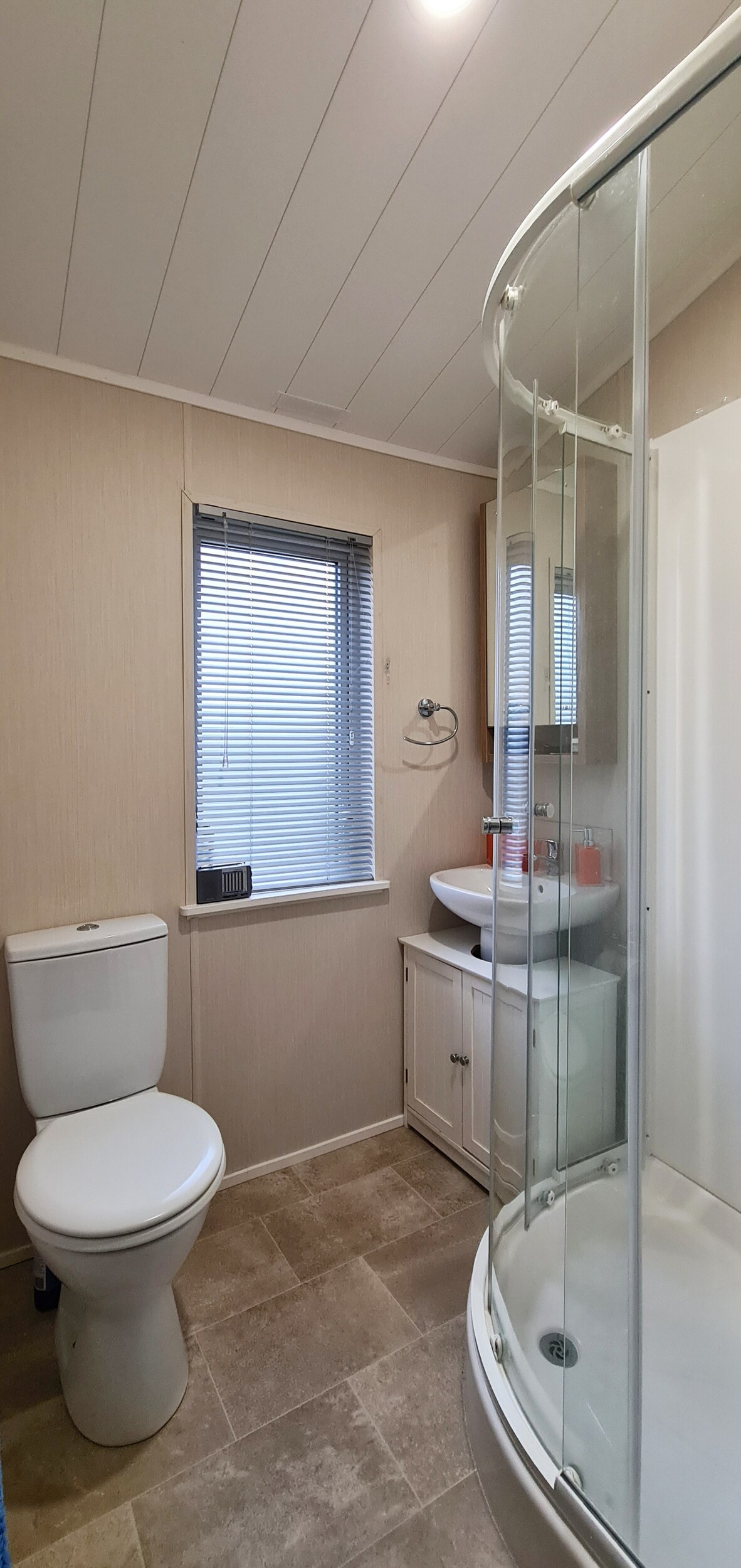 Modern shower room with corner shower cubicle, WC and wash hand basin with vanity cupboard below. Flush ceiling light. Venetian blind. Vinyl flooring. Extractor fan.