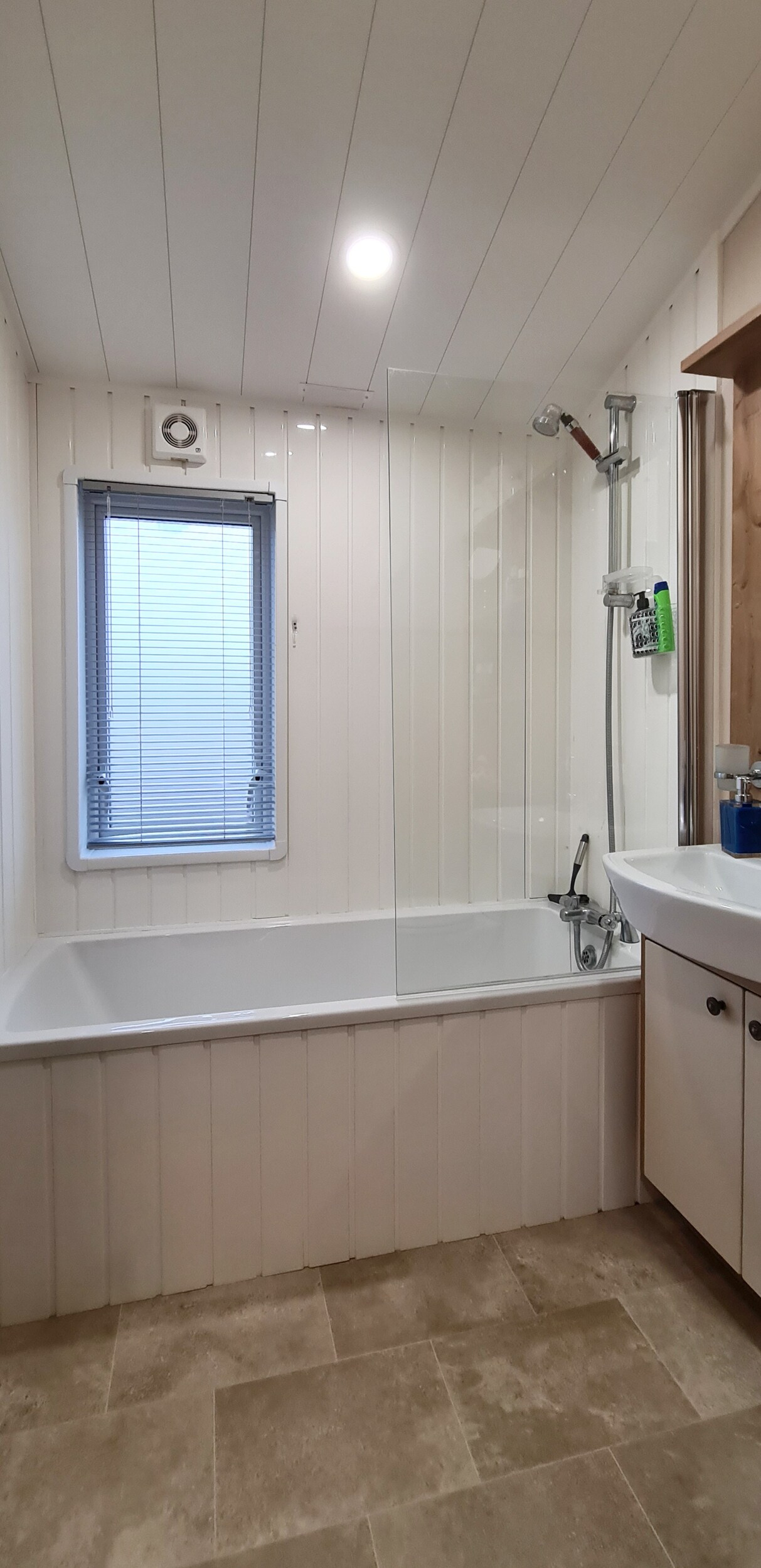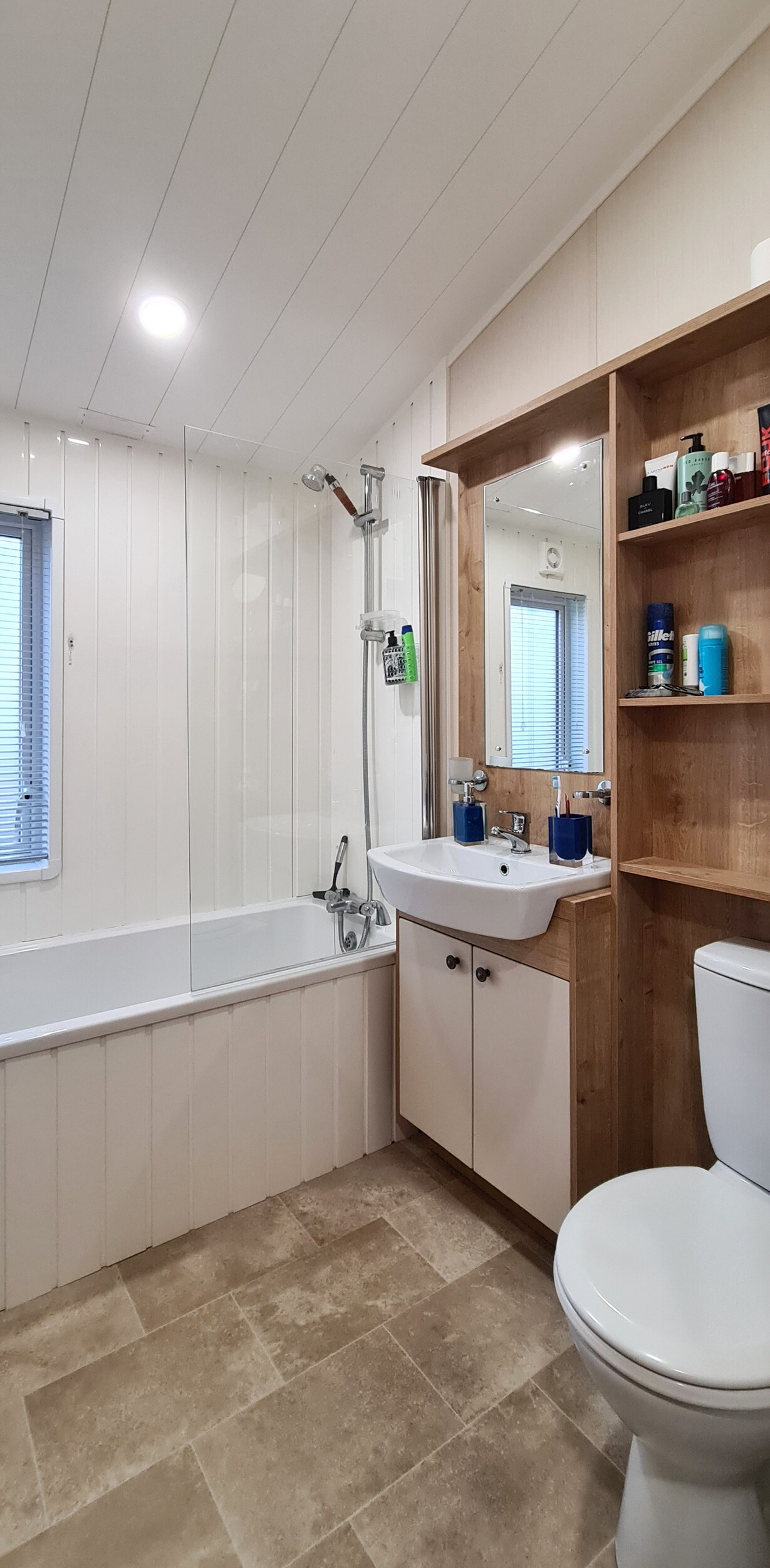 Modern bathroom with vanity sink unit, WC, and surrounding shelving with mirror. Bath with shower over. Glass shower screen. Flush ceiling lights. Towel radiator. Venetian blind. Vinyl flooring. Extractor fan.