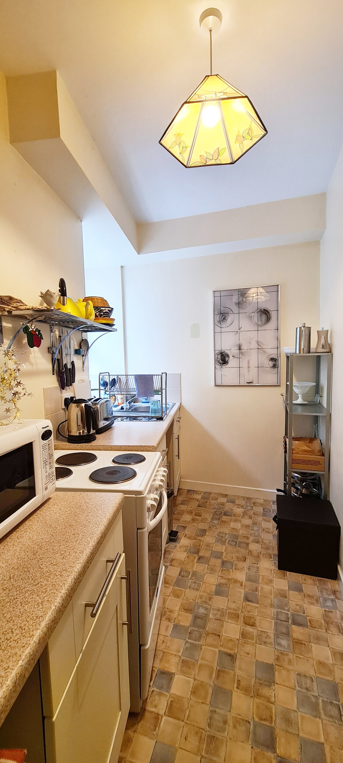 Base units with contrast worktop. Stainless steel sink unit with drainer and mixer tap. Electric cooker. Under counter fridge. Pendant light. Vinyl flooring. Extractor fan. Baxi combi boiler (serviced yearly). Window to side.