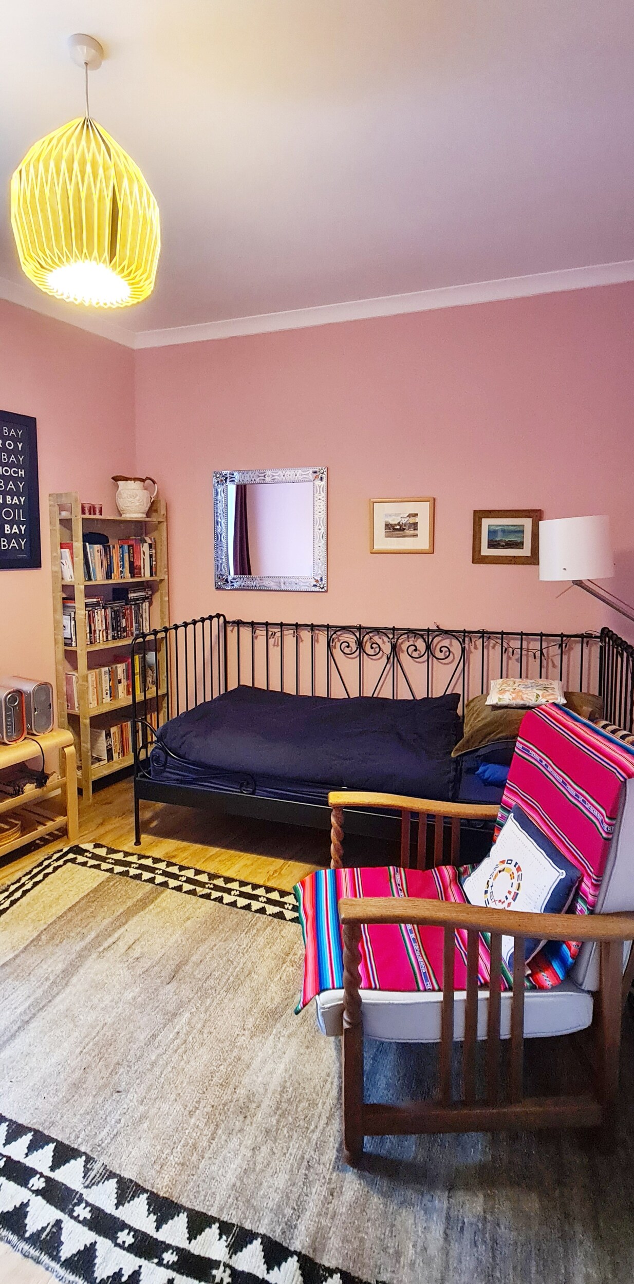 Window to front. Pendant light. Curtains. Laminate flooring.