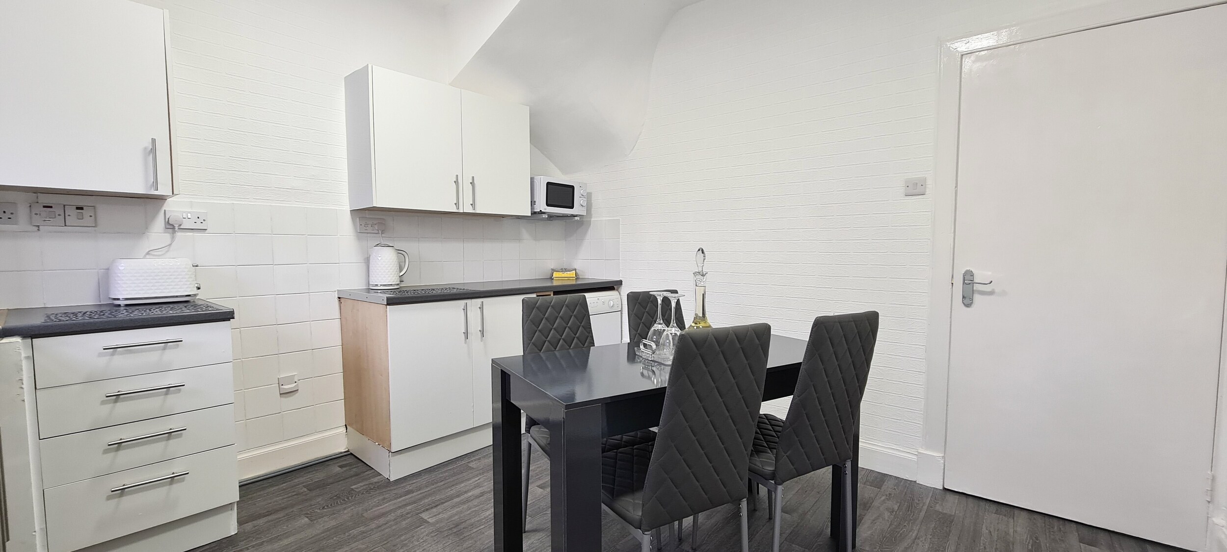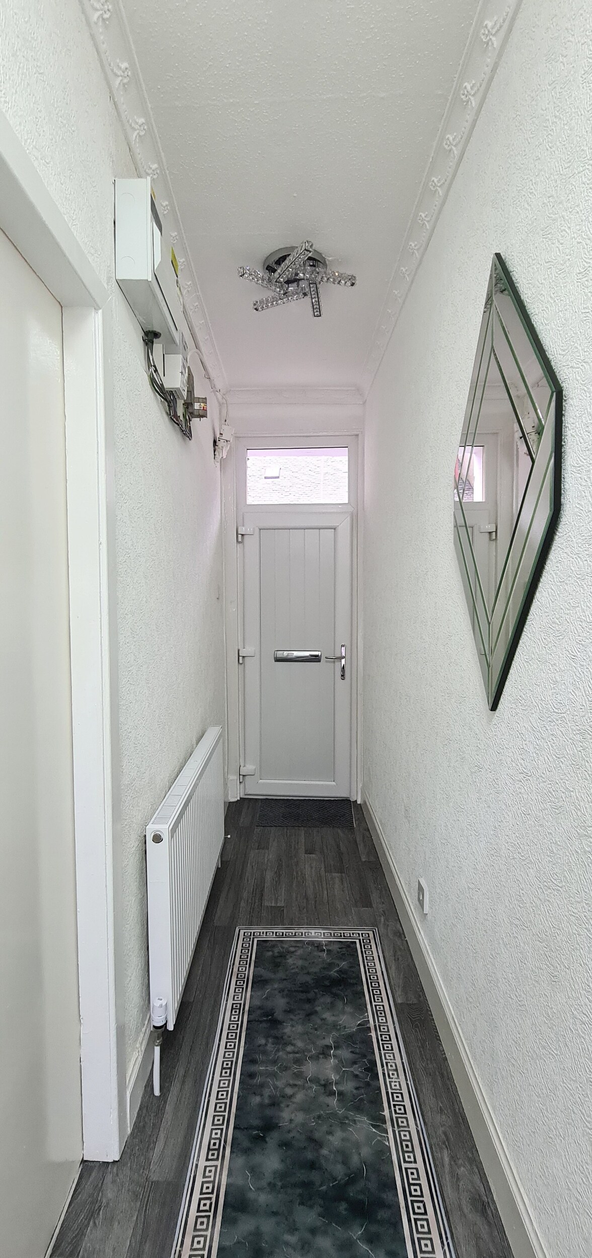 Exceptionally spacious kitchen with plenty of room for dining. Range of base and wall units. Tile splashback. Contrast worktop. Stainless steel sink unit with drainer. Logic combi boiler. Flush ceiling lights. Smoke alarm. Extractor fan. Vinyl flooring. Venetian blind. Door to enclosed exclusive garden to rear.