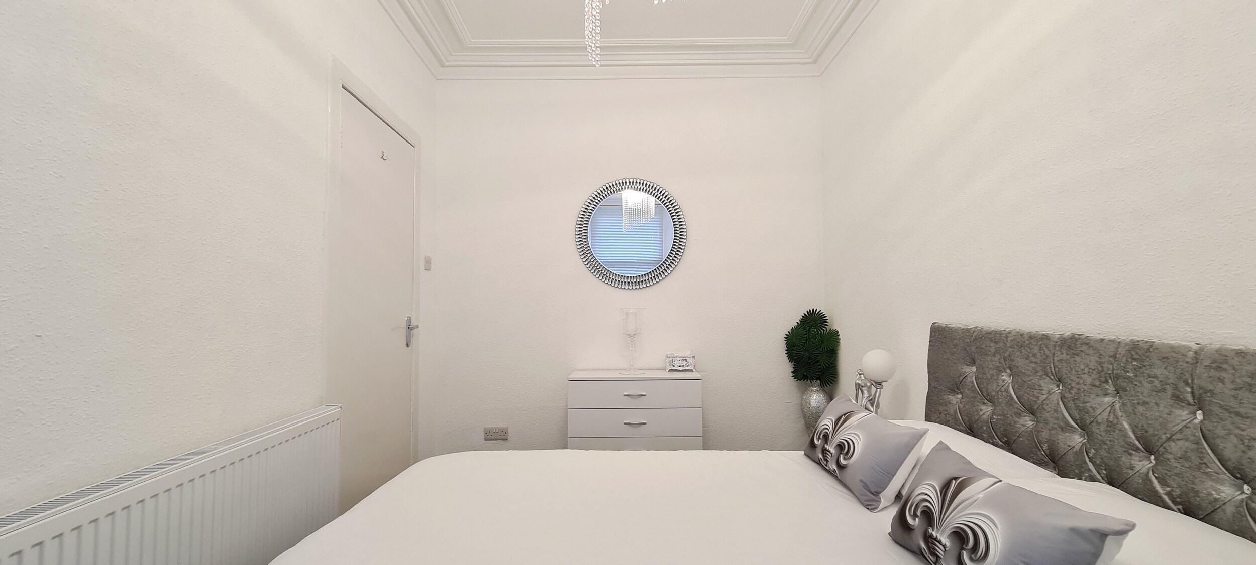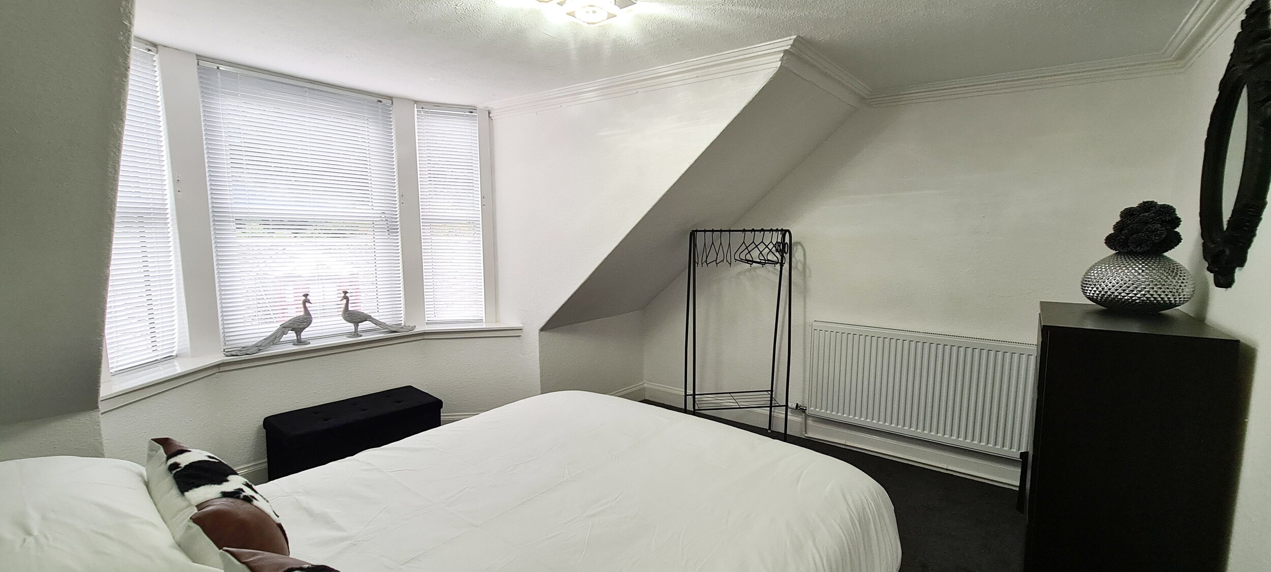 Double bedroom with two large bay window to front. Ceiling light. Venetian blinds. Carpet.