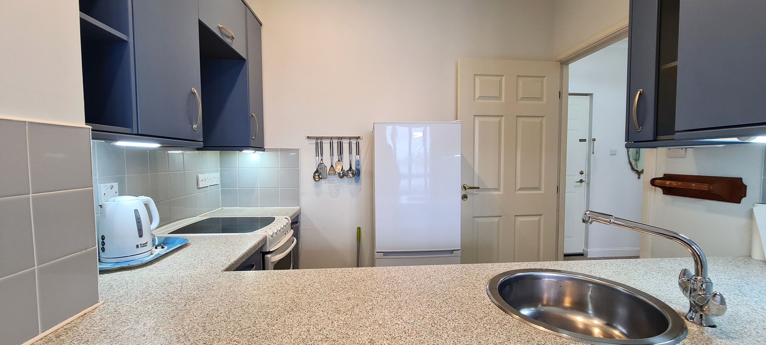 This bright and well-proportioned lounge offers a warm and inviting living space, featuring large windows to front and doors to either side leading to the exclusive balconies to enjoy the panoramic sea views towards Loch Striven. A charming decorative fireplace with elegant white surround and brass accents, perfect as a focal point. Neutral-toned walls and carpet. The room benefits from an open-plan design with a convenient breakfast bar creating a seamless connection to the kitchen area. Curtains. Ceiling light.
