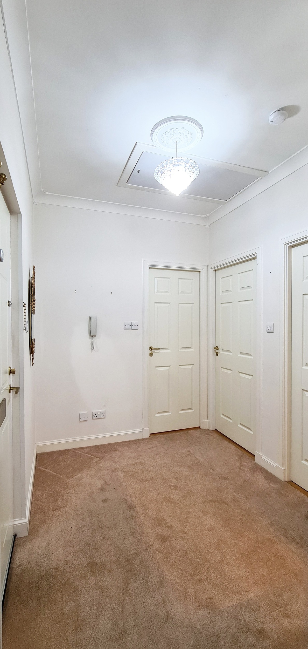 Spacious hallway with great storage. Shelved cupboard housing electricity meter and switchboard and central heating controls (1.90m x 0.91m). Matching doors to all rooms. Ceiling lights. Smoke alarm. Secure entry handset. Carpet. Loft hatch.