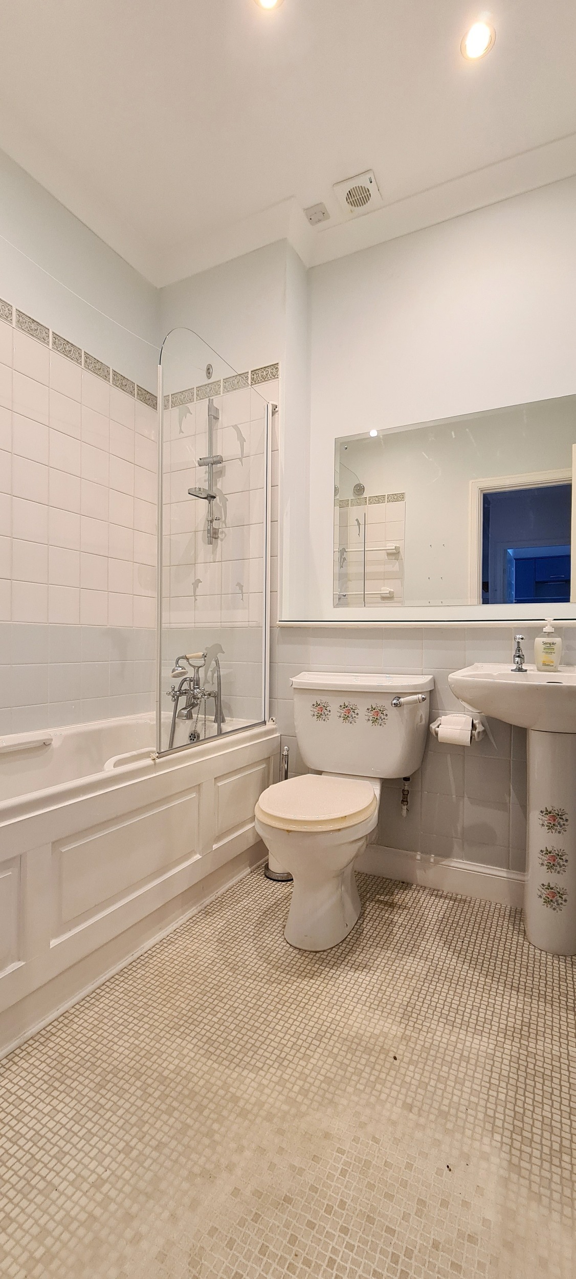 The bathroom is fitted with a three-piece suite comprising a panelled bath with shower over, tiled splashback, and a glass shower screen. There is also a pedestal wash basin and a WC. Extractor fan. Electric chrome ladder style towel radiator. Wall mirror. Spotlights. Vinyl flooring.