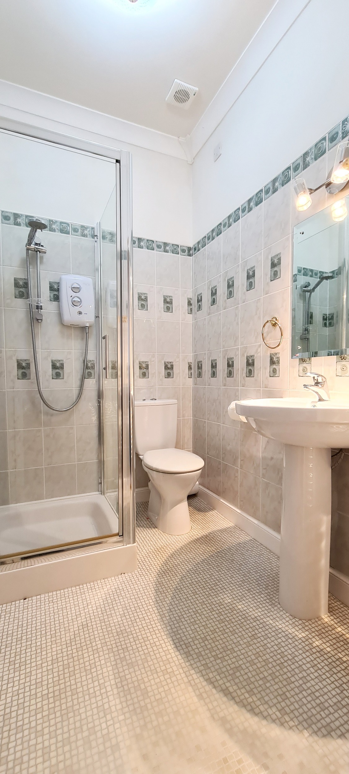 Partially tiled shower room. Shower cubical. Triton electric shower. WC. Wash hand basin with pedestal. Vinyl flooring. Towel radiator. Extractor fan. Wall mirror.
